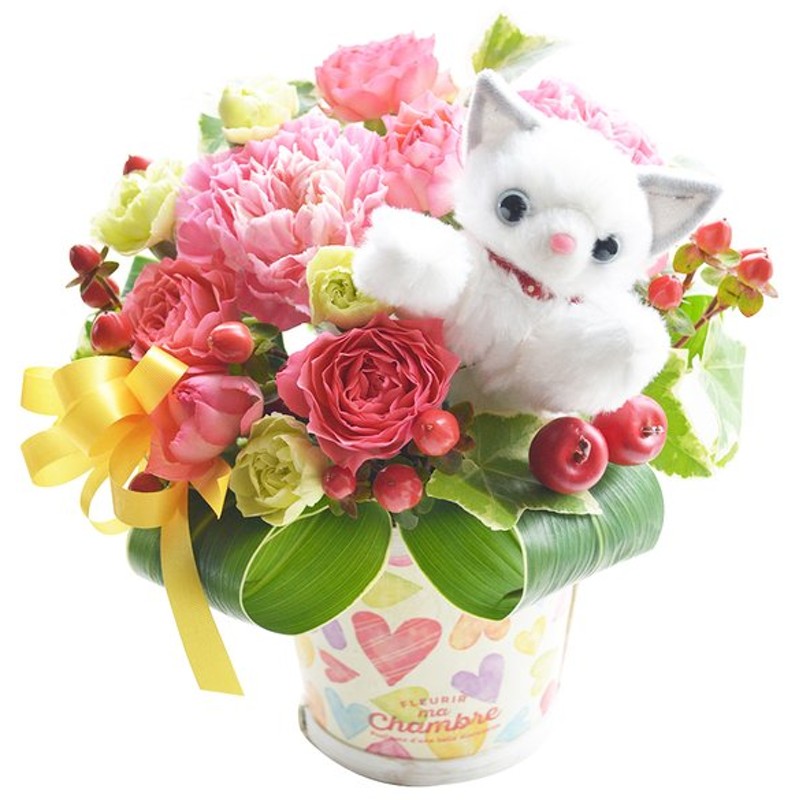 花 白猫ピック付 アレンジメント バラ カーネーション フラワーギフト
